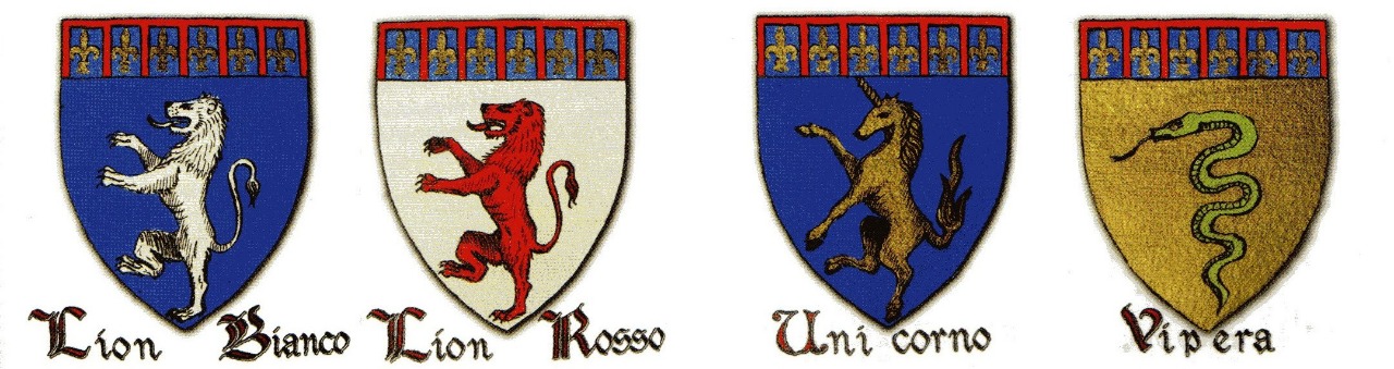 Il Quartiere di Santa Maria Novella comprende 4 Gonfaloni di Compagnia : Lion Bianco, Lion Rosso, Vipera, Unicorno.